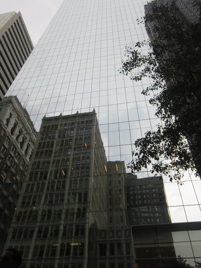 The architectural contrast between the two is stark, and can best be appreciated when the older is viewed in the reflection of the newer. 20th century meets 21st. Told you it was shiny.