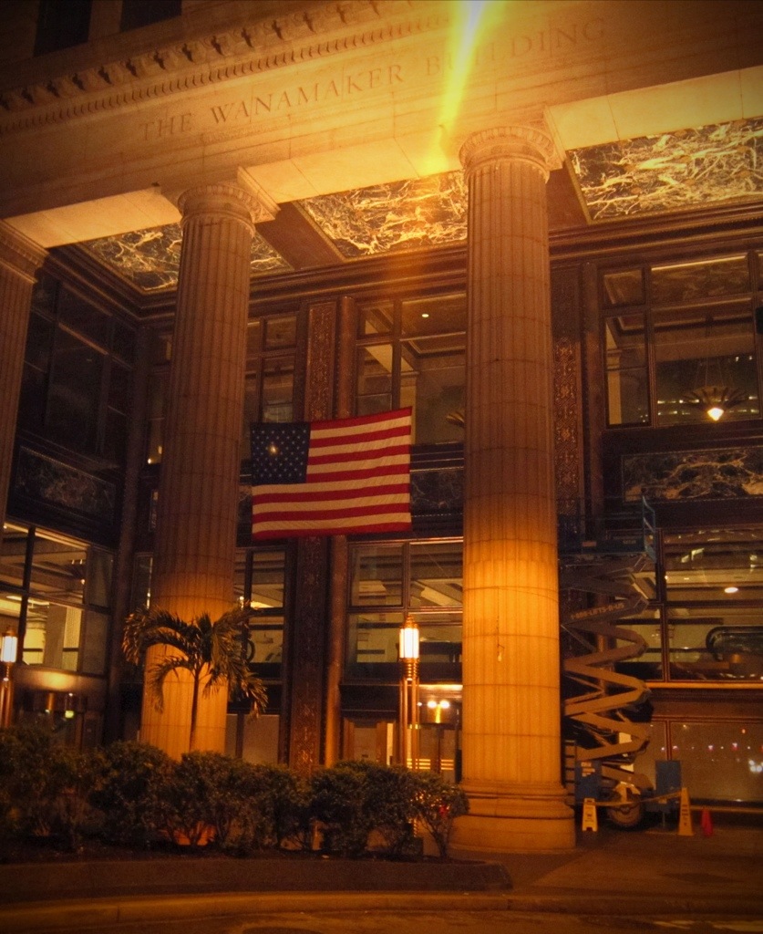 The last thing I saw before the lure of the king-size bed back at my hotel (after a week of alcohol-hindered sleeps in a tiny dorm bed) began to become all-consuming, was the Wanamaker building. It’s basically just a big-ass department store, but it has a large set of doric columns that my mother would find appealing, a nicely hung US flag, and a palm tree, so it would be rude not to include it.