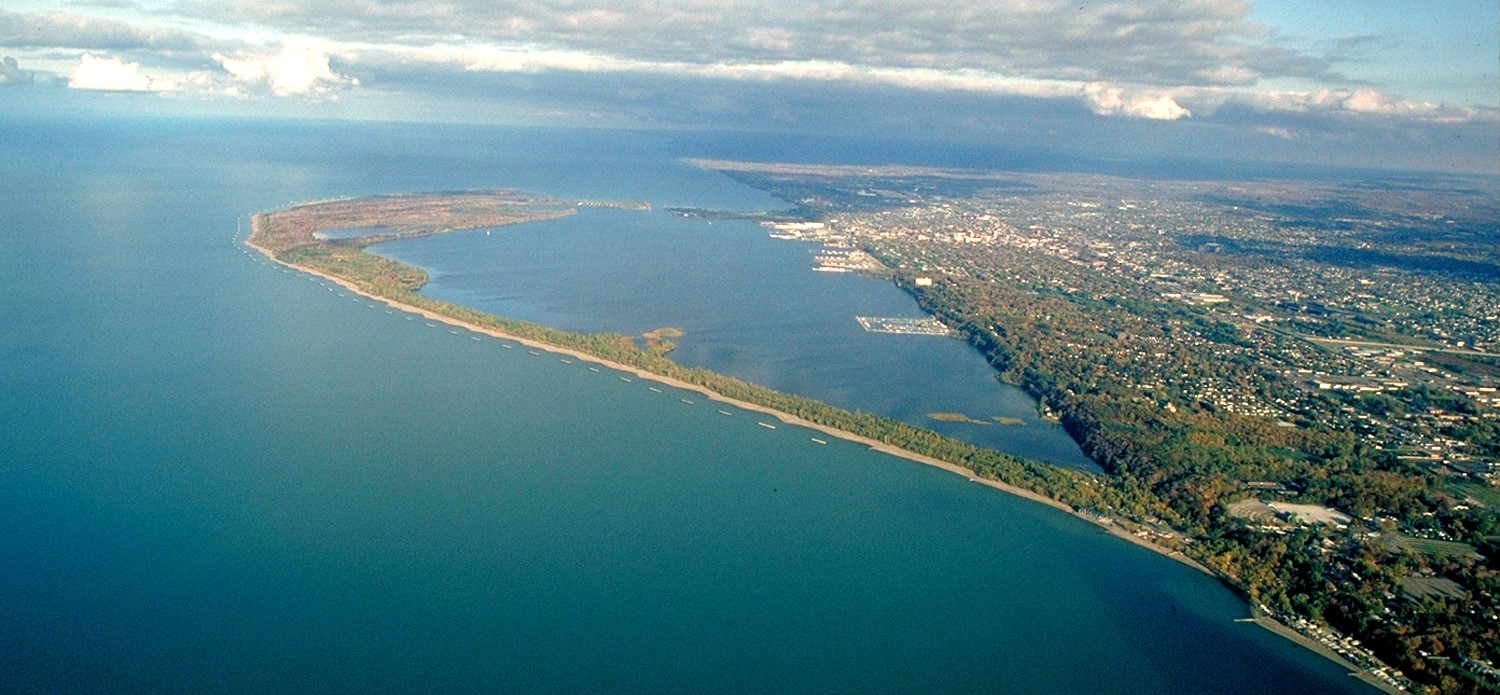 Anyway, here’s an aerial pic to illustrate. They yacht club is the white rectangle about half-way down the coast of the inner lake, and Colleen’s house is about half-way between that and those green blobs floating in the near corner of the inner lake (those were the reeds we kayaked to). The white at the other end of the inner lake is downtown Erie and the harbour there. The spit itself is called Presque Isle.