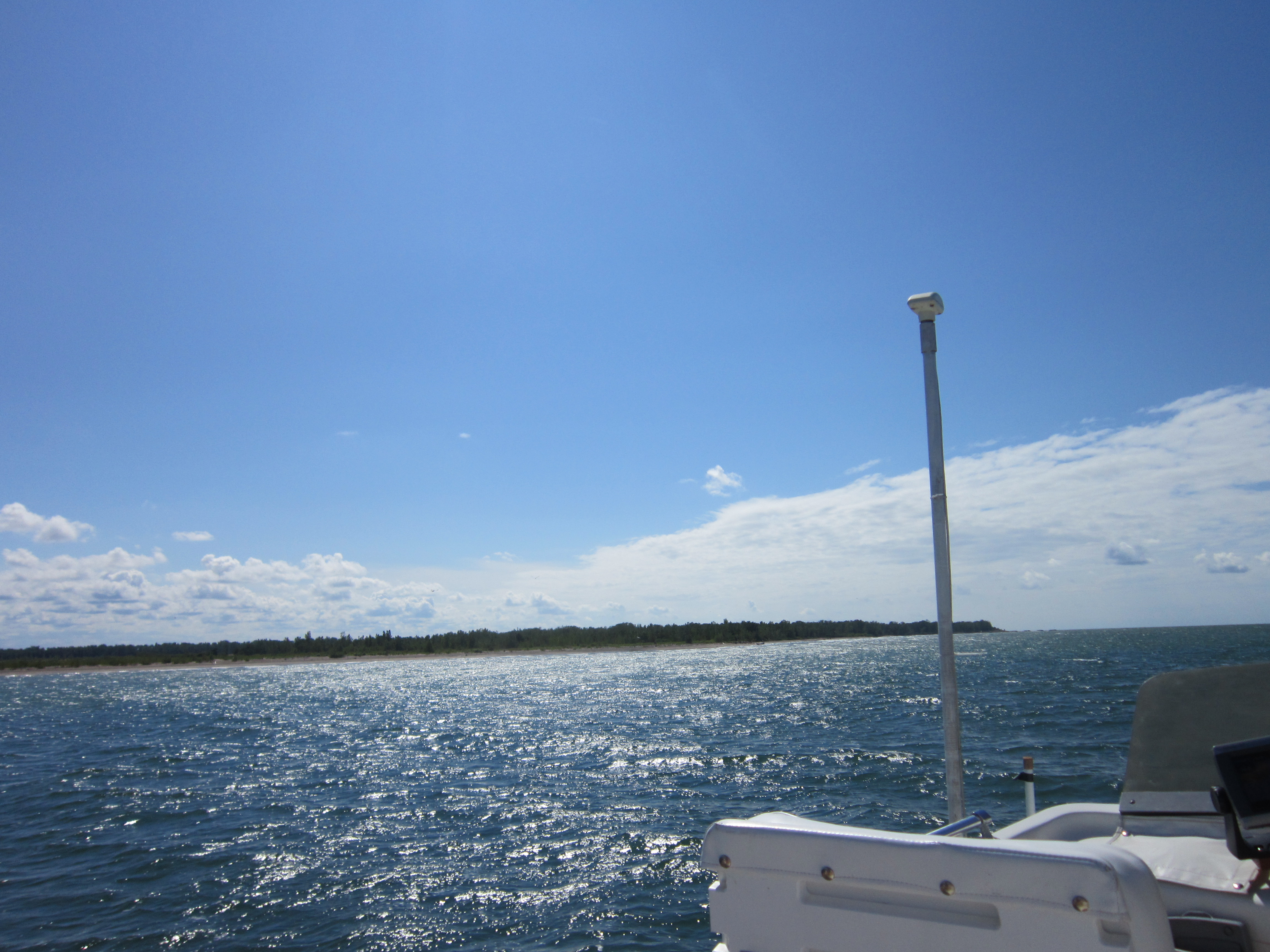 We puttered about the lake at full speed, with the fresh breeze in our faces, then turned back towards Erie, where we re-entered the inner lake with its calm, warm waters, and had some sandwiches and drinks by the edge of the spit beside a seagully beach.