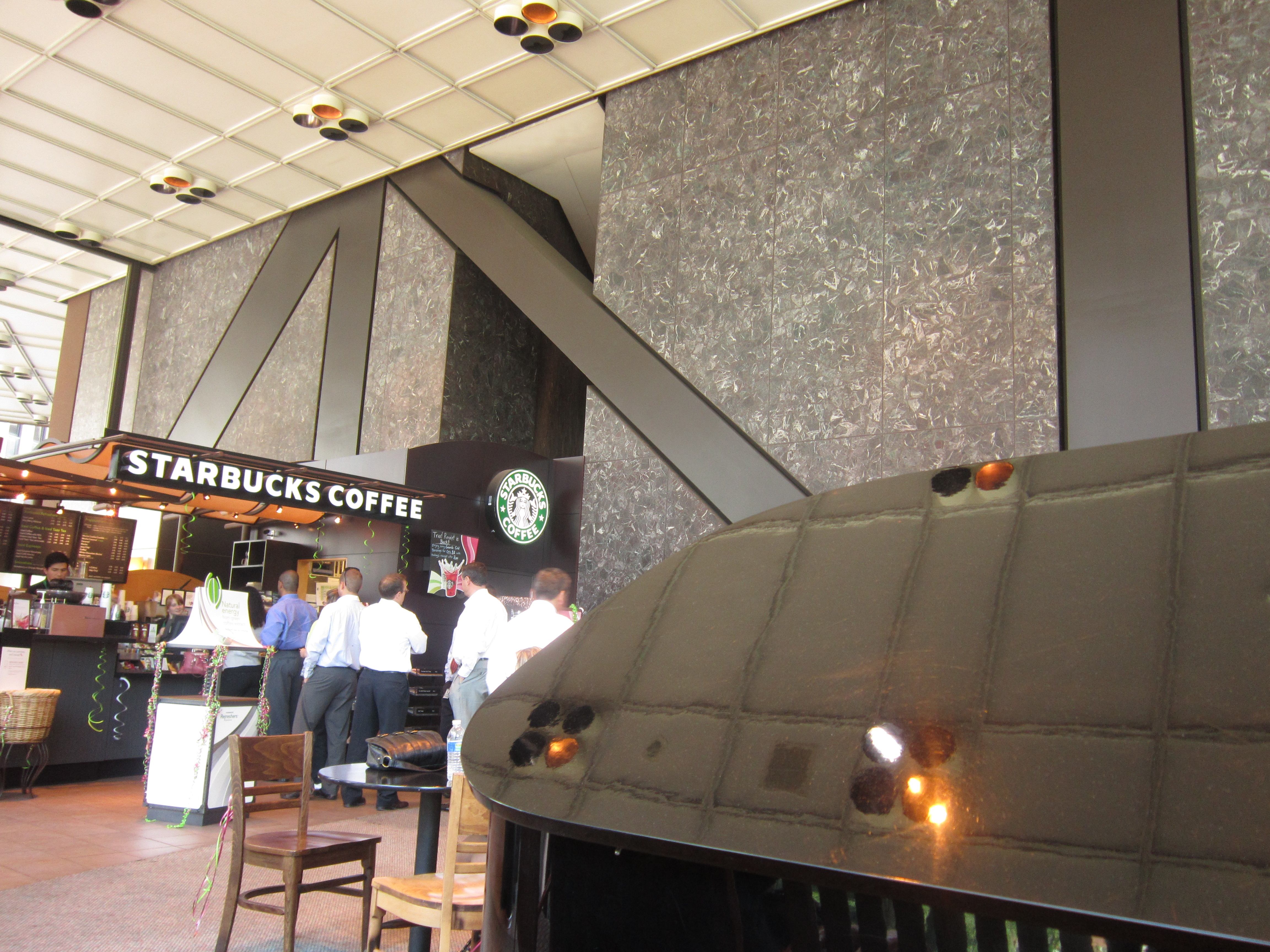 Inside, I hear the soft tones of jazz piano. I follow my ears across the lobby and up an escalator and, lo and behold, I arrive at a Starbucks, where there’s a full-sized grand piano complete with suited up pianist tinkling away. As much as I’d normally prefer to drink my coffee anywhere but Starbucks… THEY HAVE A PIANIST. So I got a latte.
