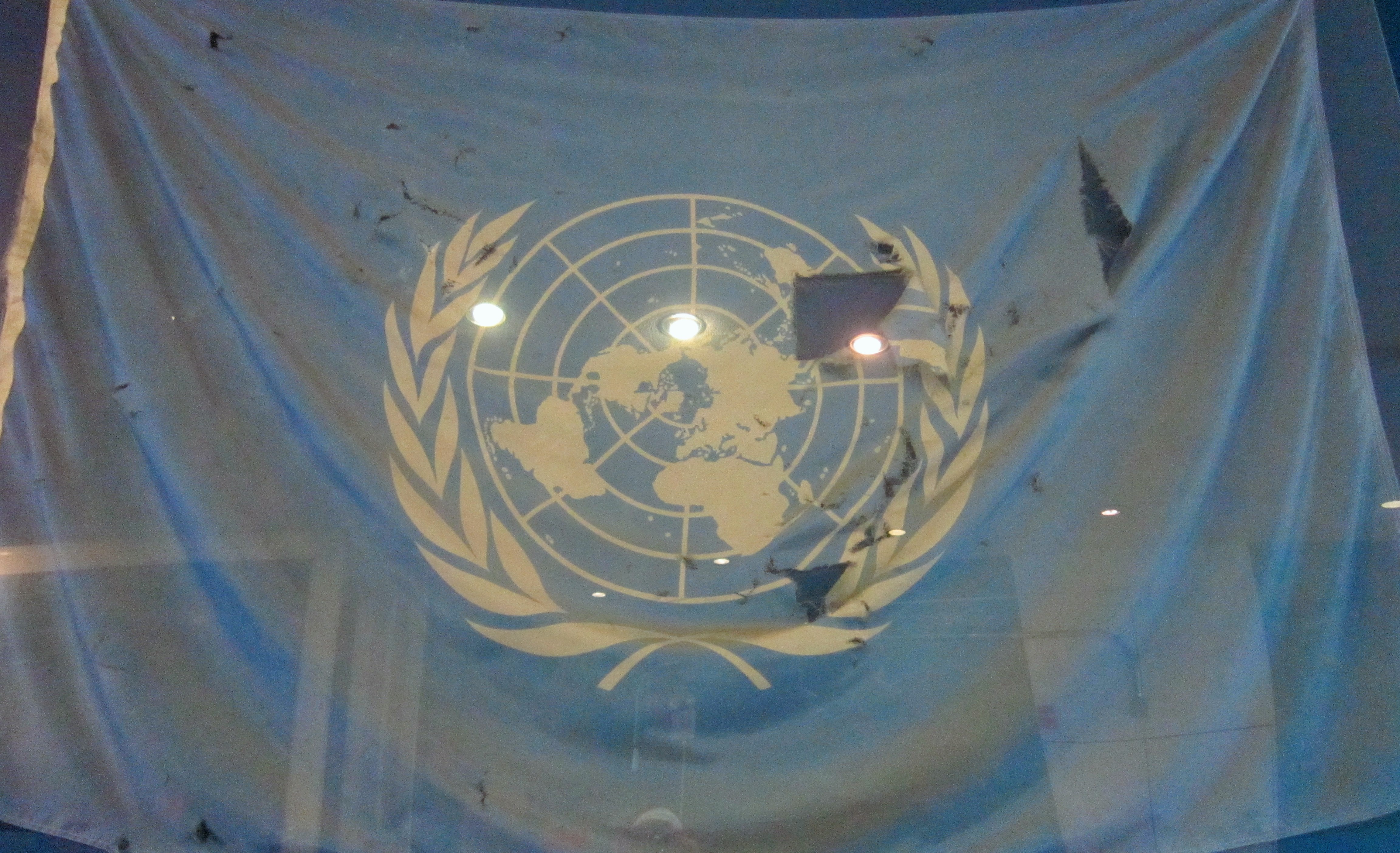 This is the flag that flew above the Canal Hotel, the UN headquarters in Baghdad. From June 2013, the United Nations Assistance Aission in Iraq, led by the Secretary General’s Special Representative Sérgio Vieira de Mello, worked out of the Canal Hotel. Their mission was to support a new and inclusive political process in Iraq, to encourage the pursuit of human rights and justice and to assist the emerging civil society including a free and independent press. On August 19th 2013, a bomb ripped apart the Canal Hotel, killing 22 UN employees, including Vieira de Mello. 22 people who were working for a better world and a freer Iraq.