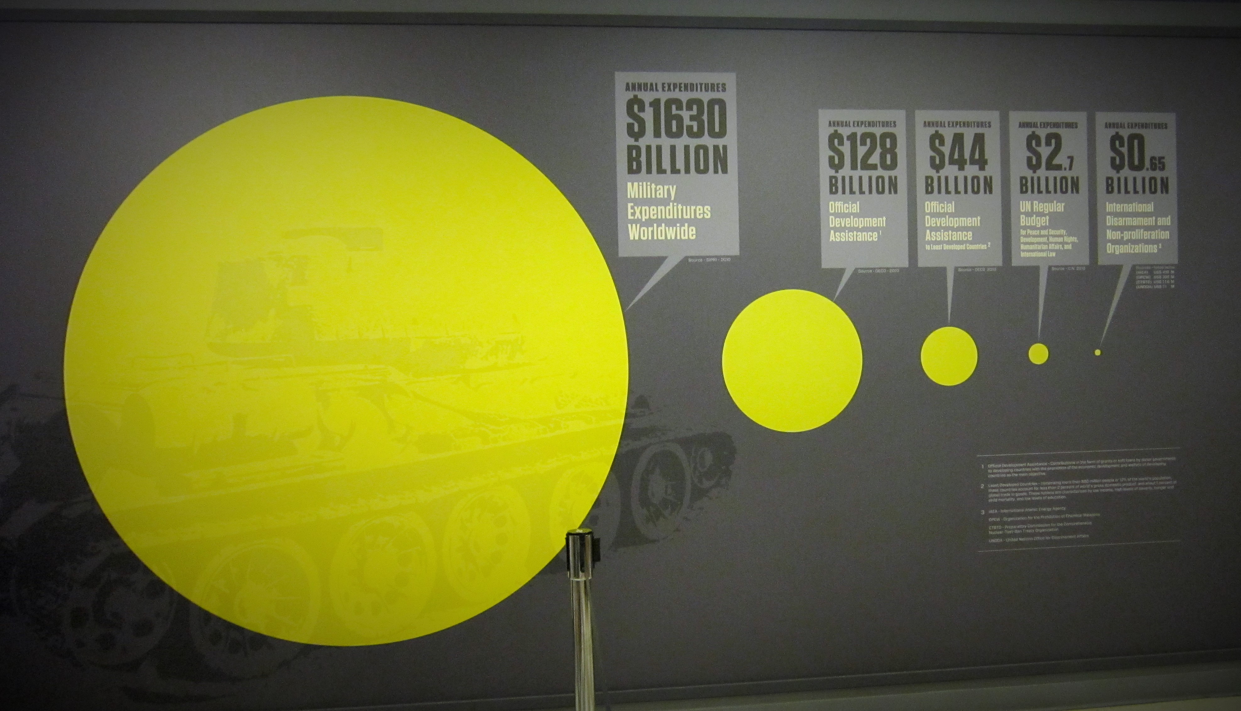 The tour starts, and we are led away from the lobby to the upper floors of the building. On the way to the elevator there is this chart. If you cant read it… the big yellow dot ($1630 billion) is annual worldwide military expenditure. Weapons, training, the like. The tiny dot at the other end ($0.65 billion) is annual worldwide expenditure on international disarmament and non-proliferation. As in getting rid of all the stuff that kills people. The one to the left of that is the entire annual UN budget, and the other two are international development assistance (the smaller of the two being what goes to the least developed countries).