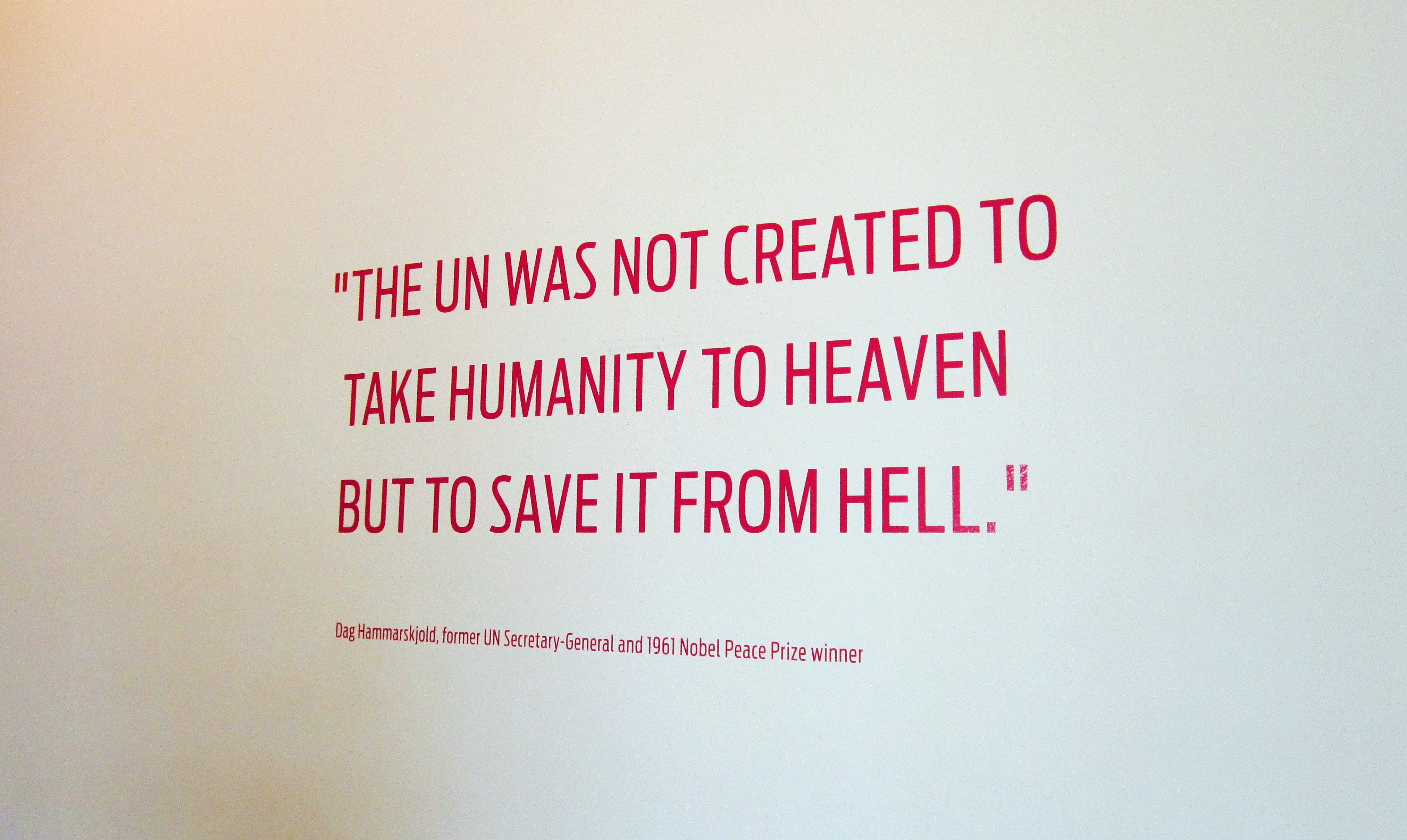 Those two rooms were pretty much where all the action happens. The rest of the tour was kind of like an exhibition of war, with, among many others, displays of old guns, iconic blue helmets from through the ages, and melted metal from Hiroshima (tin cans, coins and stuff reduced to puddles by the superheated air from the blast). There was murals and information about the various conflicts throughout the world that the UN has been involved in in the last 50 years or so. It was a sobering and enlightening 45 minutes to go through it all properly and take it all in.