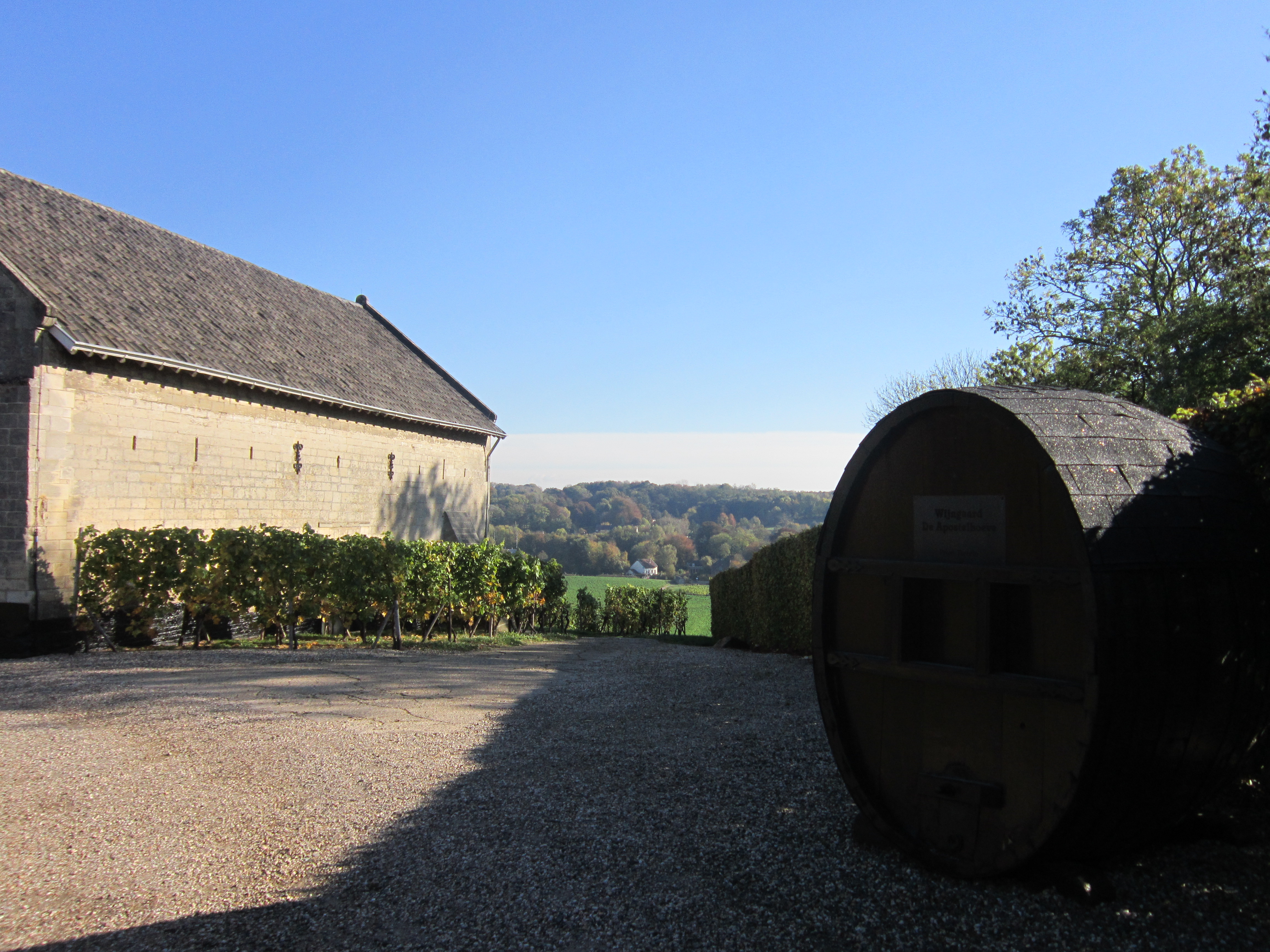 The vineyard is called Apostelhoeve and sits at the top of a small hill (an enormous mountain by Dutch standards). The views of the surrounding countryside from the top are stunning. Well worth the hike. The large barrels are also very comforting. Wine.