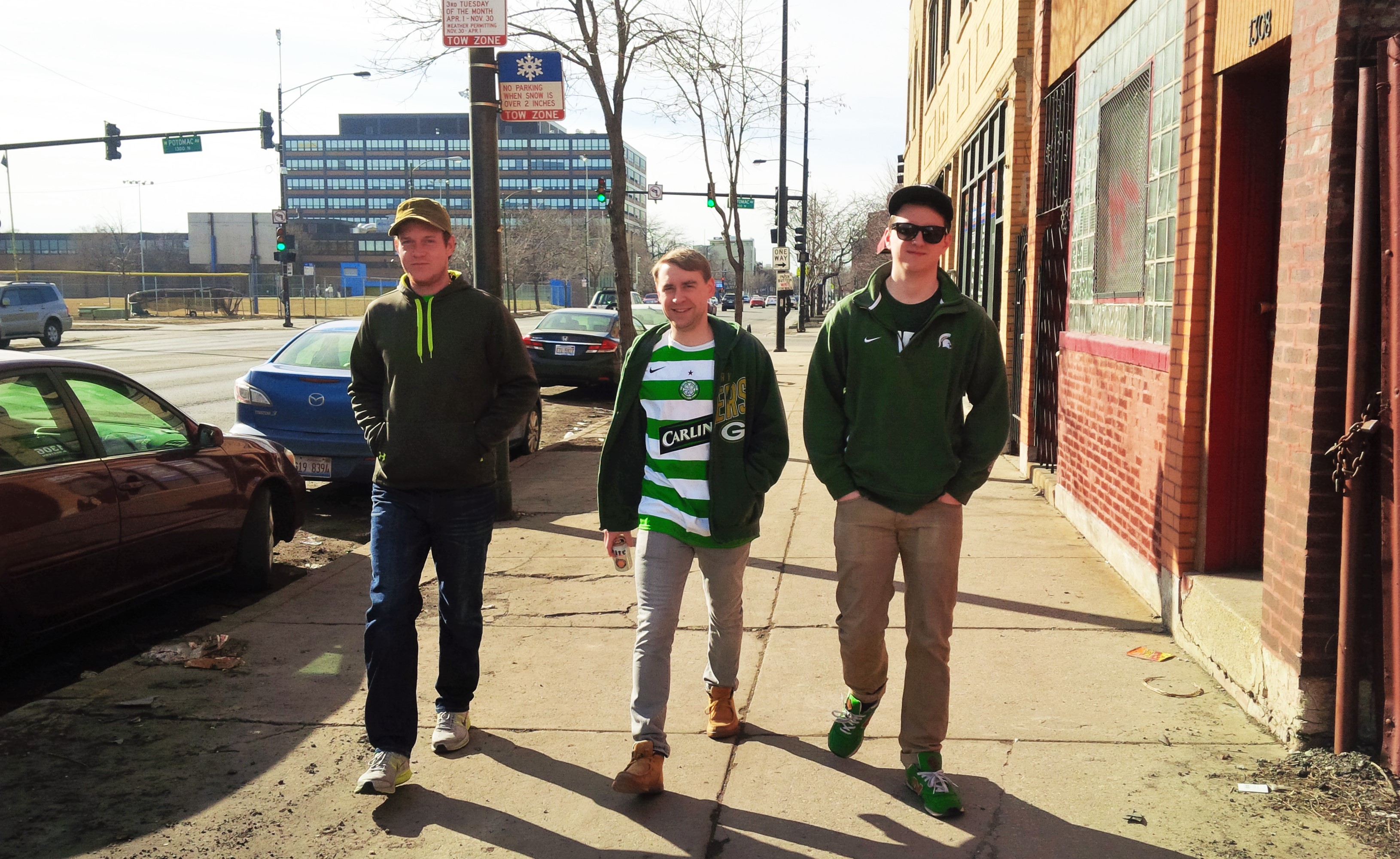 We prepared ourselves for the day’s activities by rounding up all the hip flasks in the building and filling them with Jamieson, and pouring gin and tonic into Fiji Water bottles. Sure, we’re going to be flouting the open carry laws all day, but we don’t want to rub it in the CPD’s face, do we? Donning the greenest clothes we could find, we set off through Wicker Park to the Blue Line El station.