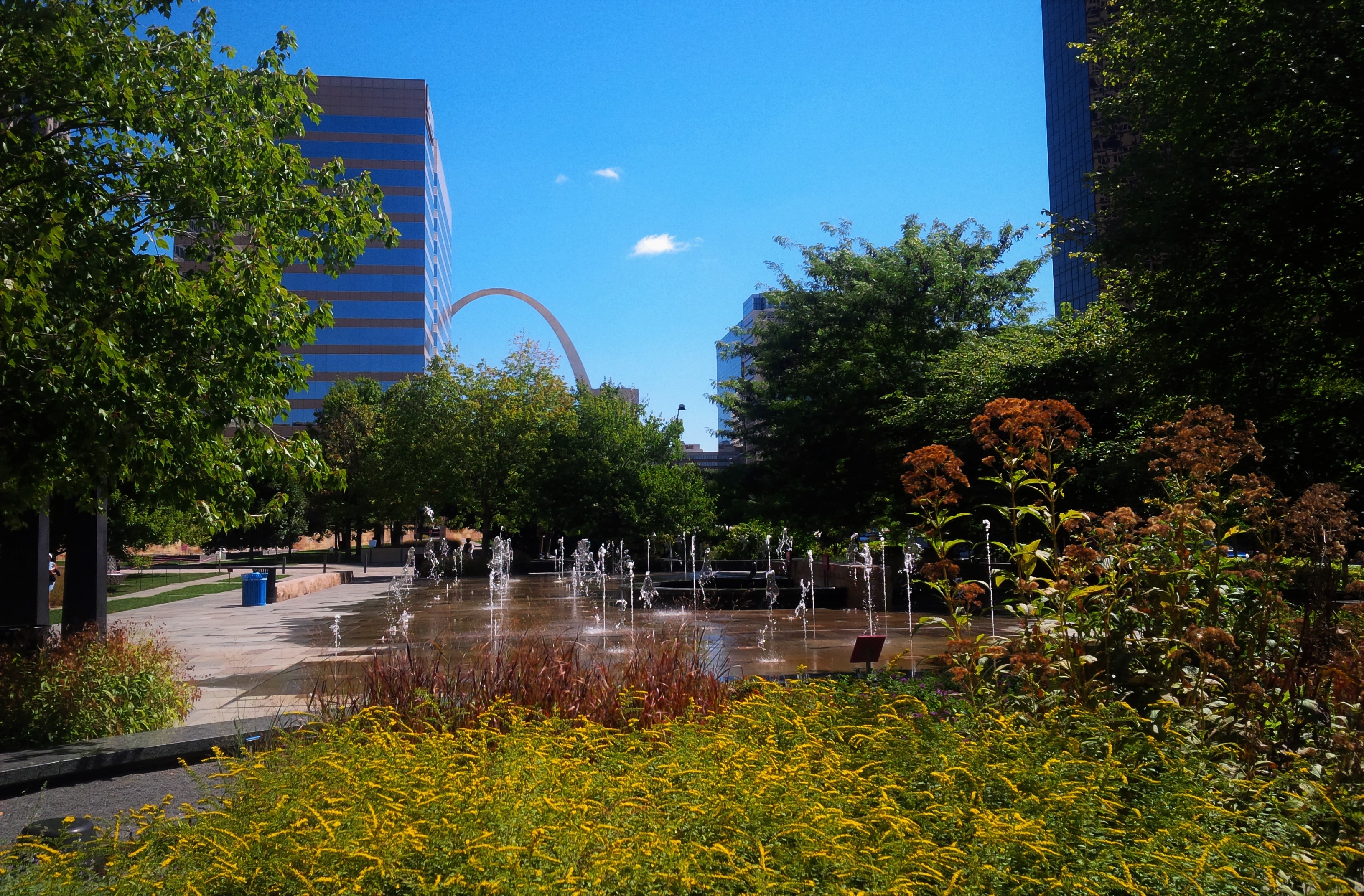 Then there’s a fancy shrub garden with a winding path through it, which leads up to a concrete plaza with fountains all over it. I can see the gateway arch now, which is nice. I can put my map away cause I know where I’m going.