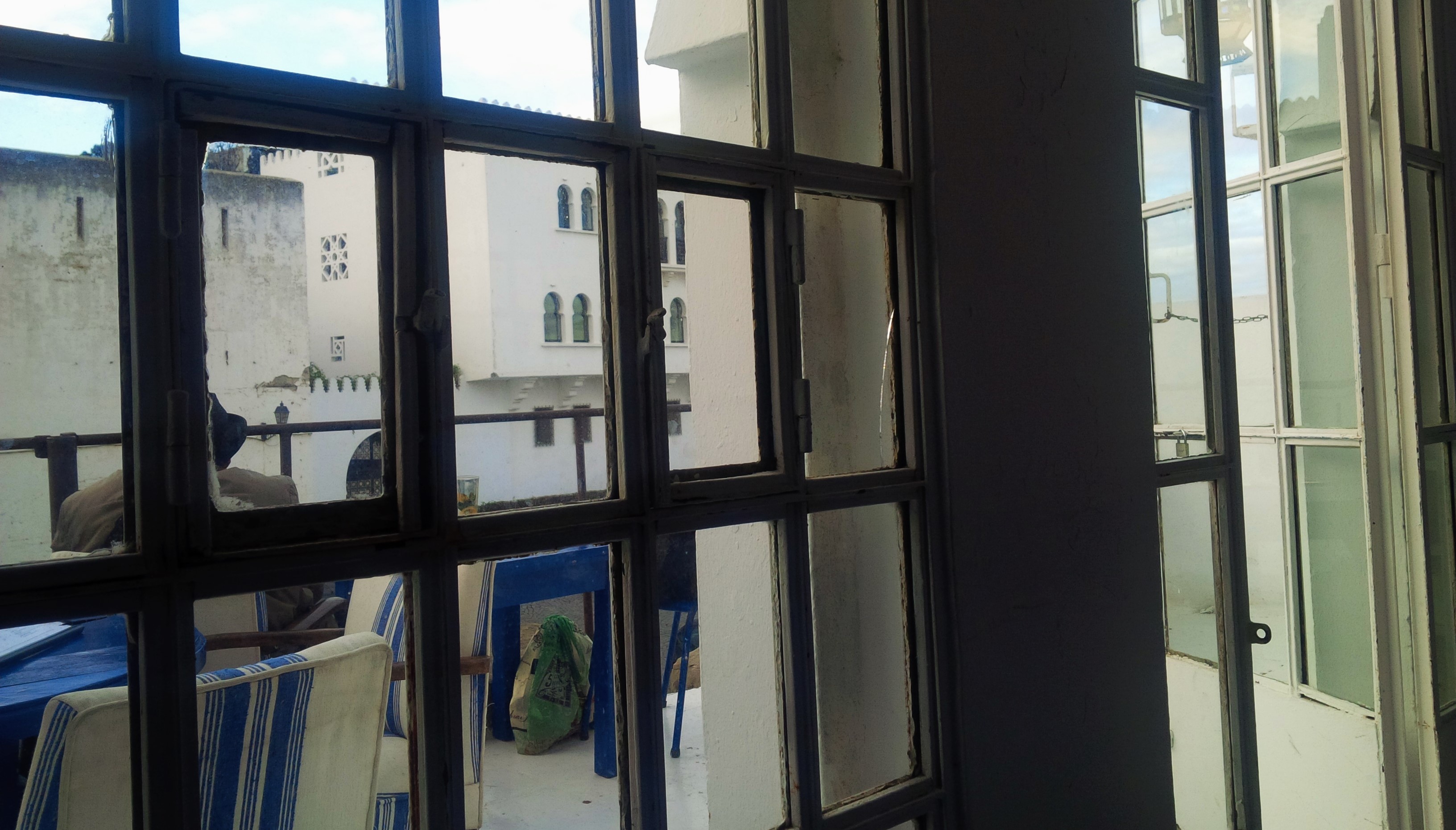 The streets widen somewhat as we near the top of a steep hill, and Shamir tells us that we are approaching the Kasbah, an ancient fortress that once defended the city. He shows us the impressive and intricate horseshoe arch that is the famous Kasbah Gate, but before going through, turns around and points to a lovely white building opposite. This is the restaurant he wants us to have lunch in. Cool. When we walk in, Shamir and the maître d’ have a short conversation in Arabic – they clearly have some sort of deal where he brings tourists here and gets a cut. He says he will meet us outside when we have finished eating, and the waiter takes us up the stairs to our table.