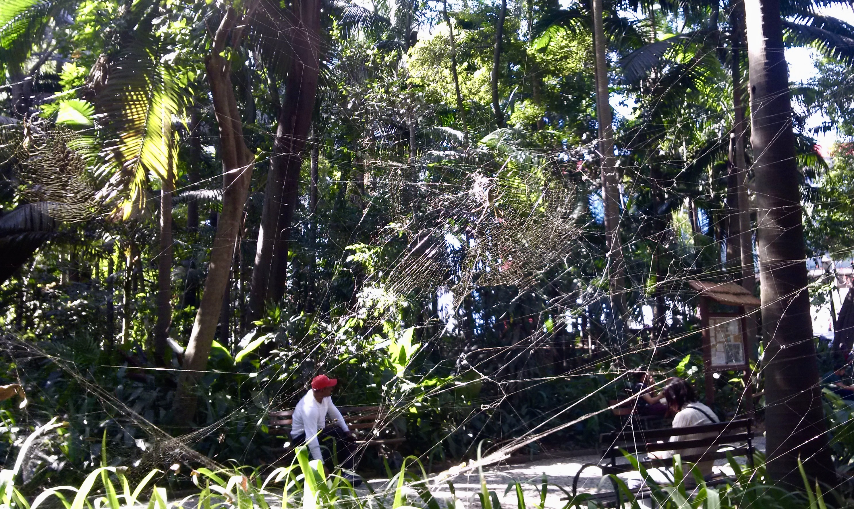 Have you ever seen an 8ft spider web? Ok, so it’s more of a massive fucking conglomeration of spider webs, but they’re spun between two palm trees that are legitimately 8 feet apart. There’s about five massive spiders sitting in it, one in the centre of each webby nucleus, and as I’m leaning in pretty close to take the photo, the wind is picking up and I’m half expecting them to be blown into my face, but I persevere because I need to get a decent picture, which is hard with the current lighting. Happily the spiders stayed in their webs, content to be marvelled at from afar.