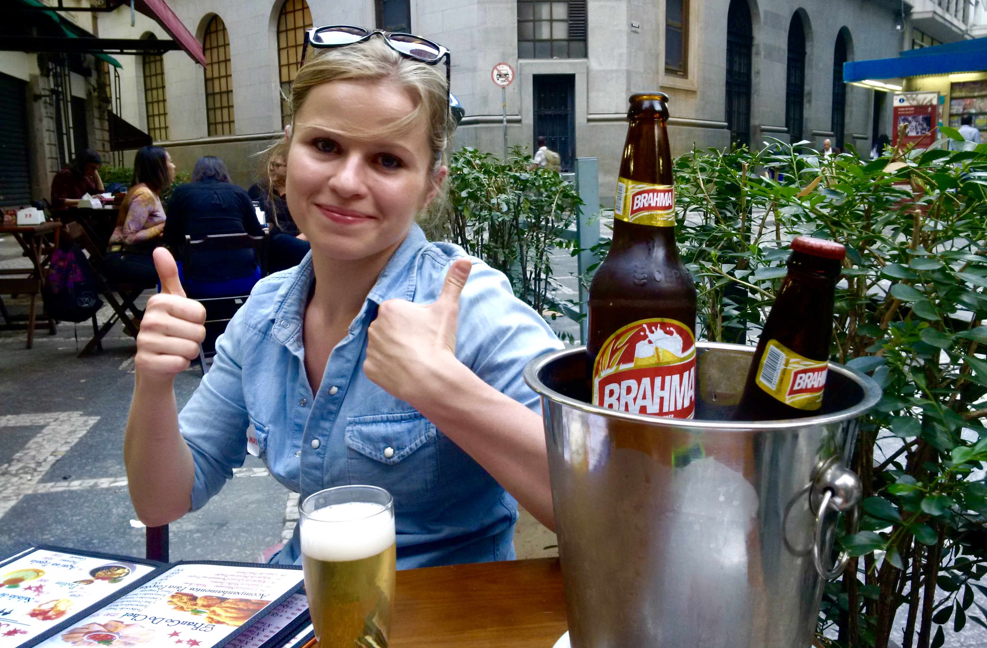 After that, we really did deserve a beer, and this time we settled in to a nice bar called Café Alhambra and drank Brahma in the traditional way, which involves ordering giant bottles, keeping them in an ice cooler on your table, and pouring the beer into tiny glasses to drink out of. Such fun.
