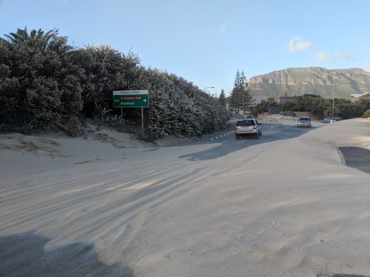 I’m leaving the city for a couple of days and heading south a bit down the Cape to Hout Bay because it looked nice on google maps and there hasn’t been a riot there since September. I got off the bus near a roundabout at the bottom of Victoria Avenue and noticed, as it literally slapped me in the face, that most of the beach (which I couldn’t yet see) was airborne and travelling at speed.