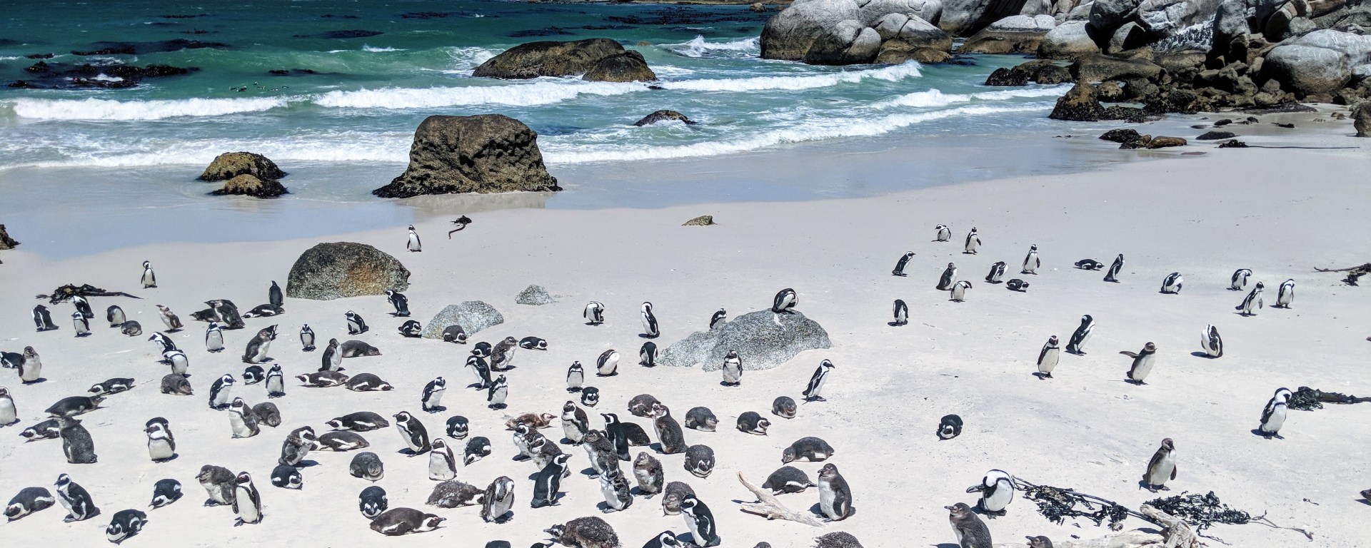 Boulders Beach, like Windmill Beach where I’ve just been, is sheltered from the wind and the waves by big rocks, making it an ideal place for penguins to breed and hang out. The penguins in question are African Penguins, the only type of penguins you get this continent, and they can be found in colonies like this here and all the way up the coast to Namibia.