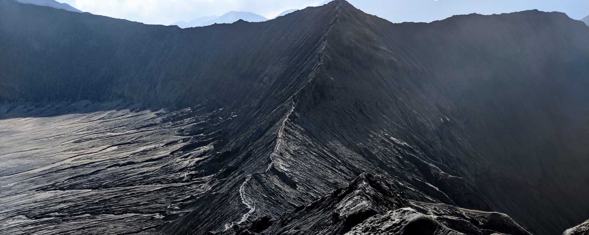 Doubts were beginning to creep in about the sanity of this mission which meant it was probably a good time to take a breather. I dangled one leg over each side of the ridge and sat back to appreciate what were some of the best views I’d ever seen. The jagged rim of the Bromo crater I was perched on, taller Mount Bartok just behind, the rim of the Tengger Caldera encircling them both, a ridge of mountains behind that, and to the right the giant Mount Semeru smouldering in the distance. To a volcano nerd this was paradise and after a week rushing around Java, I needed this. The rare opportunity to feel truly alone on an island of 140 million people. I stretched my legs out and looked out at the landscape of my dreams, wishing only that I had more snacks.